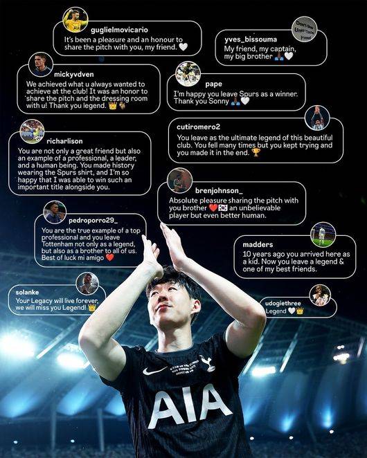 토트넘 구단도 그를 향한 찬사를 아끼지 않았다. 손흥민의 LAFC 이적을 발표하며 “그는 우리 역사상 가장 위대한 선수 중 하나”라며 “유로파리그 우승으로 10주년을 장식했고, 이제 450경기 이상을 뛴 네 번째 선수가 됐다”고 밝혔다. 또한 “푸스카스상과 득점왕, 그리고 주장으로서의 첫 트로피까지 — 그는 클럽의 진정한 상징이다”라고 덧붙였다.