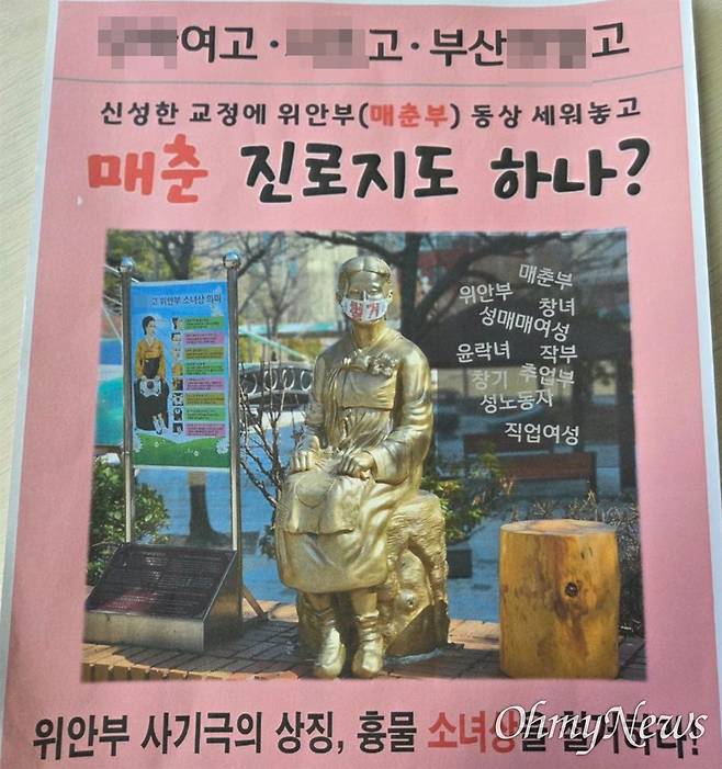 이 단체는 홍보물에 "서울 A여고·서울 E고·부산 F고 신성한 교정에 위안부(매춘부) 동상 세워 놓고 매춘 진로지도 하나?"라면서 "위안부 사기극의 상징, 흉물 소녀상을 철거하라"라는 혐오 글귀를 적어 놓았다. 이 홍보물에는 "매춘부, 창녀, 윤락녀, 작부" 등의 혐오성 글귀도 가득했다.