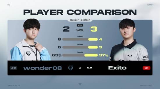 후반전에 추가 골을 넣어 격차를 4대0으로 벌린 Exito. 후반전에도 wonder08의 유의미한 반격은 나오지 않았고, 결국 Exito가 1세트를 가져갔다.