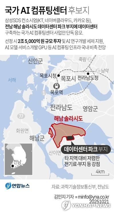 (서울=연합뉴스) 김민지 기자 = 21일 전남도 등에 따르면 과학기술정보통신부가 이날 2조5천억원 규모 초대형 사업인 국가 인공지능(AI)컴퓨팅센터의 구축사업 공모를 마감한 결과 삼성 SDS컨소시엄이 단독 응모했다.