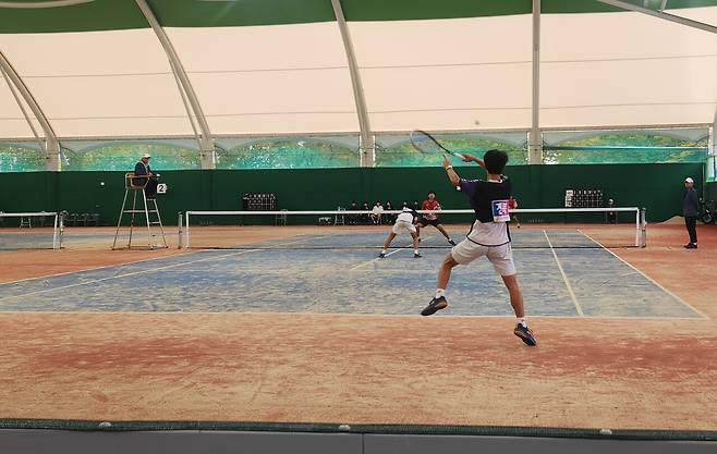 21일 오후 부산 을숙도공원 테니스장에서 열린 제106회 전국체육대회 정구(소프트테니스) 남자대학부 8강전(2복식 1단식, 3전 2선승제).