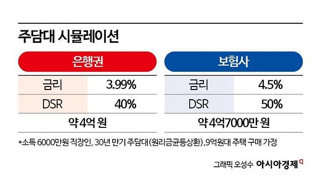 통상적으로 2금융권은 1금융권보다 금리가 높기 때문에, 원리금 부담이 커 실제 가능한 대출 한도에는 큰 차이가 없었다. 하지만 최근 정부가 대출 조이기 압박에 나서자, 시중은행들이 대출금리를 높이면서 원리금 부담도 비슷해져 한도 측면에서 2금융권이 유리해졌다. 대출상담사를 통해 주담대 시뮬레이션(연봉 6000만원·30년 만기·원리금균등상환·9억 이하 주택 구매 가정)을 받아본 결과 은행보다 보험사 주담대에서 약 7000만원 정도를 더 대출받을 수 있다는 예측이 나왔다.