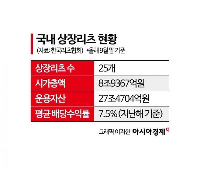 22일 한국리츠협회에 따르면 지난달 말 기준 운용 중인 리츠는 431개, 운용자산(AUM)은 113조9500억원에 달한다. 이 가운데 상장 리츠는 25개로 시가총액은 8조9367억원, 운용자산은 27조4704억원이다. 지난해 기준 운용 중인 리츠의 평균 배당수익률은 5.7%, 상장리츠의 평균 배당수익률은 7.5%로 집계됐다. 예금금리와의 격차가 커질수록 리츠를 비롯한 배당형 상품으로 자금 이동이 빨라질 전망이다.