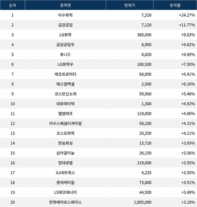 6위 LG화학우(051915)는 현재가 180,500원으로 7.50% 상승 중이다. 7위 에코프로머티(450080)는 현재가 68,850원으로 6.41% 상승 중이다. 8위 에스엠벡셀(010580)은 현재가 2,500원으로 6.16% 상승 중이다. 9위 코스모신소재(005070)는 현재가 59,900원으로 5.46% 상승 중이다. 10위 대유에이텍(002880)은 현재가 1,300원으로 4.92% 상승 중이다.