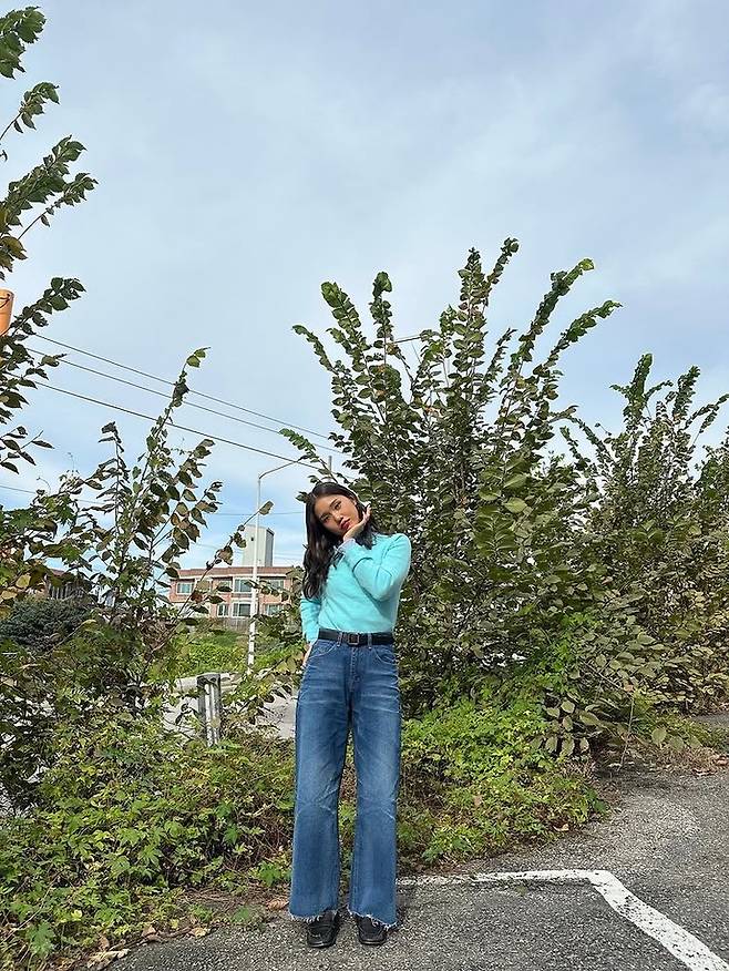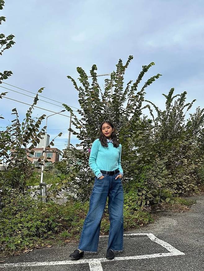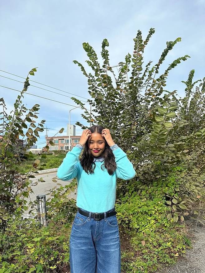 밝고 경쾌한 파란색 스웨터와 차분한 루즈핏 청바지를 매치해 산뜻하면서도 여유로운 가을 분위기를 연출했다. 흐린 하늘 아래에서도 특유의 생기 넘치는 표정과 자연스러운 스타일링이 조화를 이뤘다.