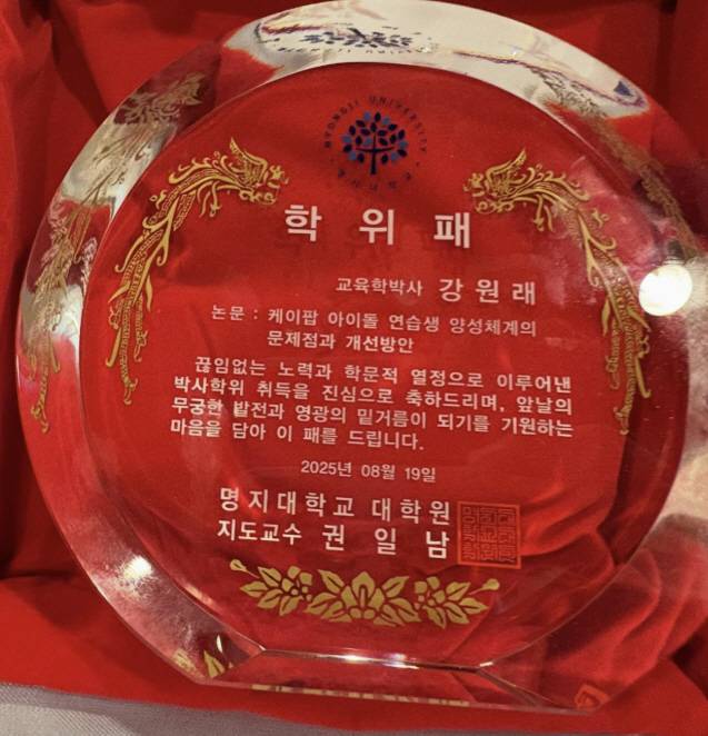 강원래는 '케이팝 아이돌 연습생 양성 체계의 문제점과 개선방안'이란 제목의 논문으로 박사학위를 따냈다. 학위패에는 '끊임없는 노력과 학문적 열정으로 이루어낸 박사학위 취득을 진심으로 축하드리며 앞날의 무궁한 바전과 영광의 밑거름이 되기를 기원하는 마음을 담아 이 패를 드립니다'라는 문구가 적혀있다.