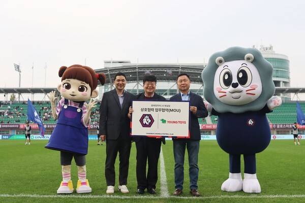 [SPORTALKOREA] 황보동혁 기자= 충북청주프로축구단(이하 충북청주FC, 대표이사 김현주)이 10월 19일(일) 청주종합경기장에서 열린 하나은행 K리그2 2025 35라운드 전남드래곤즈전에서 국내 대표 완구기업 ㈜영실업(대표이사 강철구)과 IP(지식재산권) 기반 공동브랜딩 및 마케팅 협력 업무협약(MOU)을 체결했다.