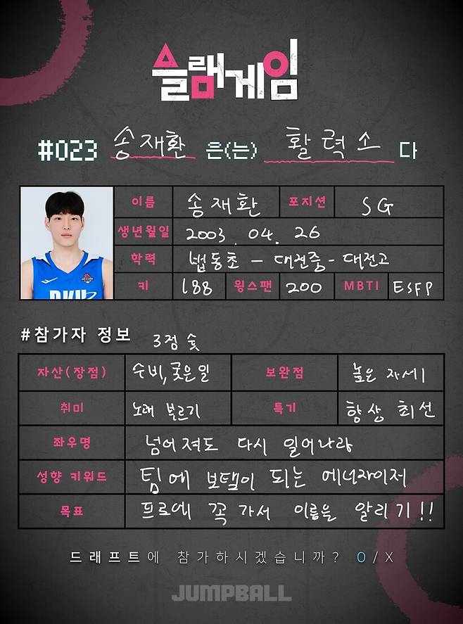 누구나 행복한 상상이라는 것을 해본 적 있지 않나. KBL 일원이 되고 싶은 꿈을 가진 드래프트 참가자들은 저마다 한 번씩 “내가 프로 선수라면?”이라는 행복한 상상을 해봤을 것이다. 그래서 물었다. 프로 선수가 된 당신은 어떤 플레이를 펼치고 팬들과 동료들에게 어떤 칭호를 받는 선수가 되어있을 것 같은지에 대해 말이다.