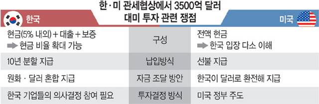 수익 배분 역시 입장이 엇갈리는 쟁점이다. 그동안 정부는 한국이 투자 원금의 90%를 회수한다면 이후 발생하는 수익에 대해선 ‘9(미국) 대 1(한국)’의 비율로 나눌 수 있다는 기조를 유지해왔다. 투자처 선정 방식도 조율이 필요하다. 미국 정부가 선정을 주도해야 한다는 트럼프 행정부 방침에 맞서 한국은 우리 기업과 정부의 ‘관여권 보장’을 요구하고 있다.