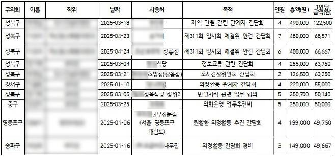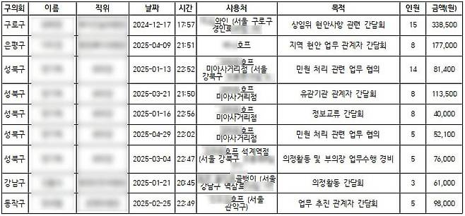 | ▲ 윤석열 체포 저지 집회 참여가 벌어지던 시기 구의회 의원들의 업무추진비 사용 내역 |