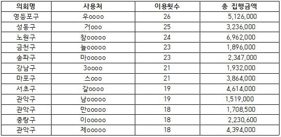 업무추진비는 다양한 장소에서 공적 성격의 회의나 간담회를 지원하기 위해 집행되어야 합니다. 그러나 분석 결과, 일부 구의회 지출내역에선 특정 업소에 지출이 지나치게 집중되는 현상이 발견됐습니다. 공정성과 형평성을 갖추어야 할 업무추진비 집행 원칙을 위배했다고 의심해 볼 수 있는 대목입니다.
