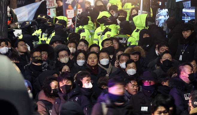 | ▲ 내란 우두머리 혐의를 받고 있는 윤석열 대통령에 대한 고위공직자범죄수사처(공수처)와 국가수사본부(국수본)의 2차 체포영장 집행이 시작된 1월 15일 새벽 서울 용산구 한남동 대통령 관저 입구에 국민의힘 김기현 의원을 비롯한 소속 의원들이 윤 대통령의 체포를 저지하기 위해 도착해 있다. |