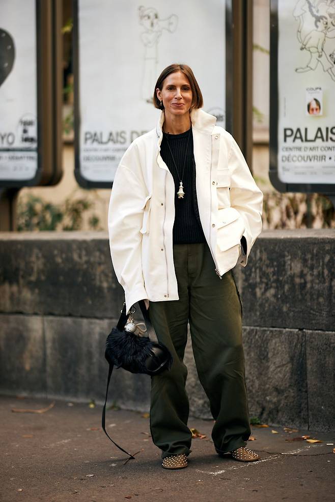 이토록 여유로운 유틸리티 룩 이라니, 군더더기 없는 쿨함이 그대로 전해지는 듯하군요. 오버핏 화이트 재킷은 얼굴빛을 환하게 밝혀주고, 짙은 카키 와이드 팬츠는 단단한 존재감을 발산합니다. 블랙 니트와 블랙 백으로 통일해 재킷과 팬츠의 조화를 극대화한 점도 인상적이네요.