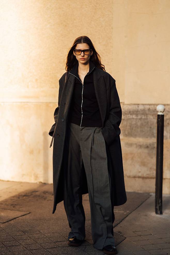 회색의 모든 스펙트럼을 한데 모은 듯한 완벽한 톤온톤 스타일링 도 와이드 팬츠 하나로 가능합니다. 묵직한 롱 코트 아래로 흐르는 테일러드 팬츠가 깊이를 만들어주거든요. 집업 재킷을 브이넥 니트처럼 레이어링한 센스도 매력적입니다. 컬러와 비율만으로 도시적인 힘을 드러내는 룩이라니, 불필요한 디테일 없이 선의 구조만으로 완성된 미니멀리즘이에요.