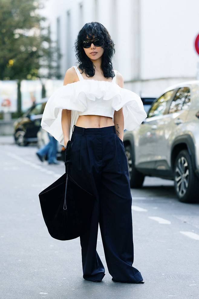 와이드 팬츠를 드레시하게 해석하고 싶다면 러플 장식의 오프숄더 톱 을 활용해보세요. 풍성한 러플과 간결한 팬츠의 무게감이 어우러지면 드레스보다도 더 강력한 존재감을 발휘하거든요. 힘을 뺀 듯하지만 자신감 넘치는 애티튜드야말로 이 룩의 핵심이죠.