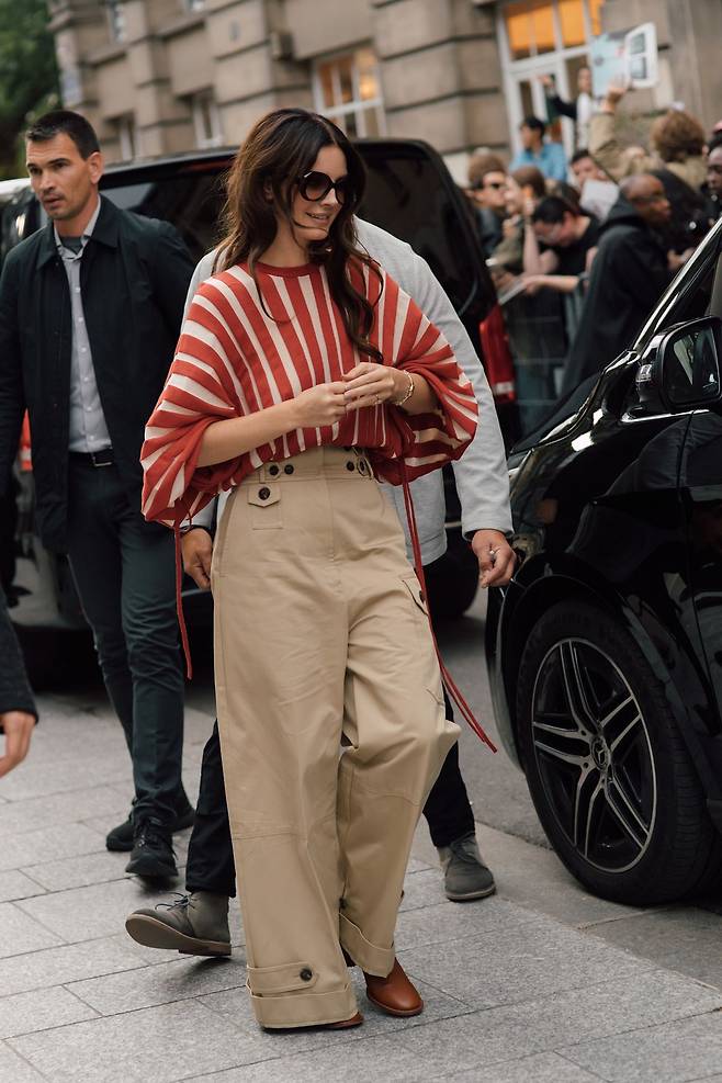 와이드 팬츠와 완벽한 궁합을 자랑하는 아이템 중 하나는 바로 스트라이프 톱 입니다. 자칫 팬츠로 치우칠 수 있는 시선을 위로 끌어올려 전체적인 밸런스를 잡아주죠. 특히 하이 웨이스트 실루엣은 다리를 길어 보이게 해주고, 탄탄한 소재의 베이지 팬츠는 구조적인 멋까지 더합니다. 단정하면서도 청량한 무드를 원한다면 이보다 더 완벽할 수 없죠.