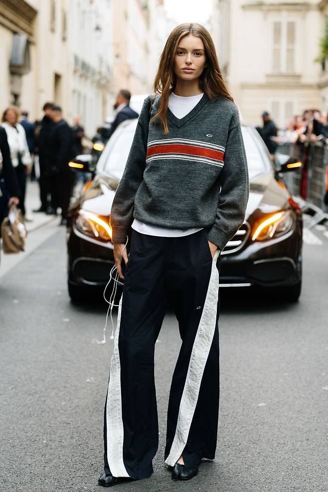 스포티한 팬츠 도 이젠 와이드로 즐길 수 있습니다. 옆선의 굵은 스트라이프 디테일이 룩에 경쾌한 속도감을 더하죠. 같은 패턴의 브이넥 니트를 매치하면 가을에 어울리는 캐주얼 룩으로 자연스럽게 변신합니다. 여기에 뻔한 스니커즈 대신 타비 플랫 슈즈를 더해 남다른 감각을 완성해보세요.