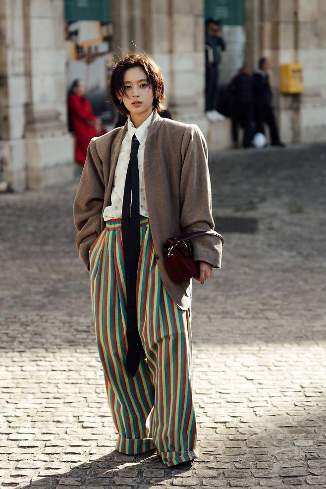 와이드 팬츠의 대담한 면모가 궁금하다면 형형색색의 스트라이프 팬츠 를 선택해보세요. 오버사이즈 재킷으로 볼륨감을 더하고, 셔츠와 길게 늘어진 타이로 실루엣에 긴장감을 부여하는 식이죠. 와이드 팬츠를 입을 땐 이렇듯 과장과 절제의 리듬을 정확히 읽는 게 핵심이에요.
