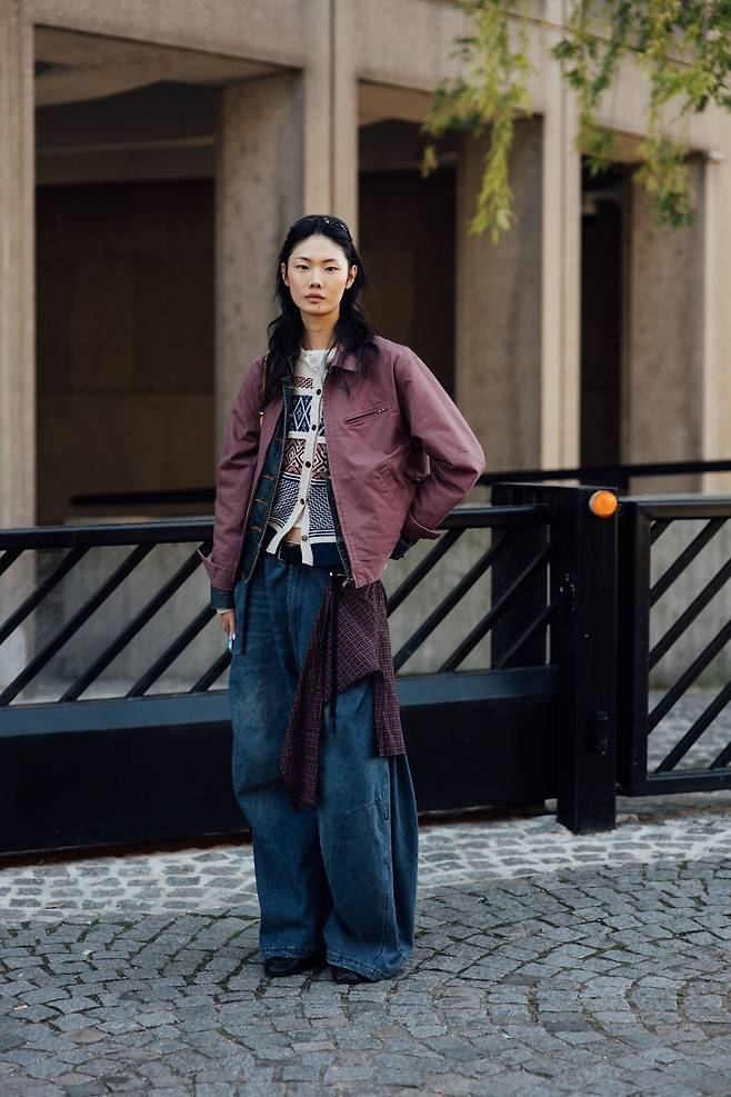 와이드 데님 팬츠 룩의 포인트는 자유로운 믹스 매치 입니다. 와이드한 청바지에 빛바랜 듯한 재킷을 더해 빈티지와 모던의 경계를 완벽히 허물었죠. 여기에 컬러 블록 카디건과 허리에 무심히 걸친 셔츠가 입체적인 리듬을 만들고요. 무심한 듯하지만 계산된 개성이 돋보이는 룩이군요.