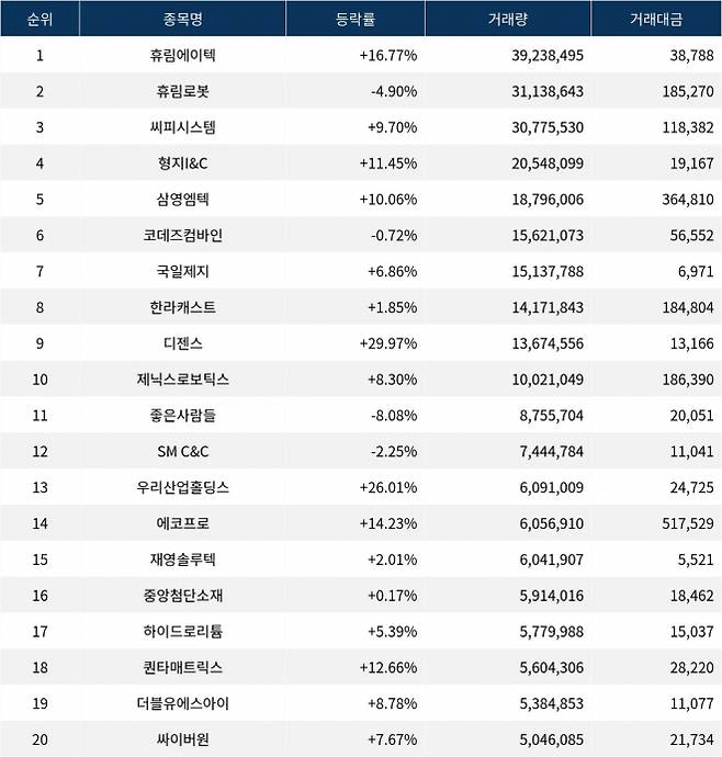 22일 한국거래소에 따르면, 휴림에이텍(078590)이 39,238,495주가 거래되며 코스닥 종목 중 실시간 거래량 1위를 차지하고 있다.