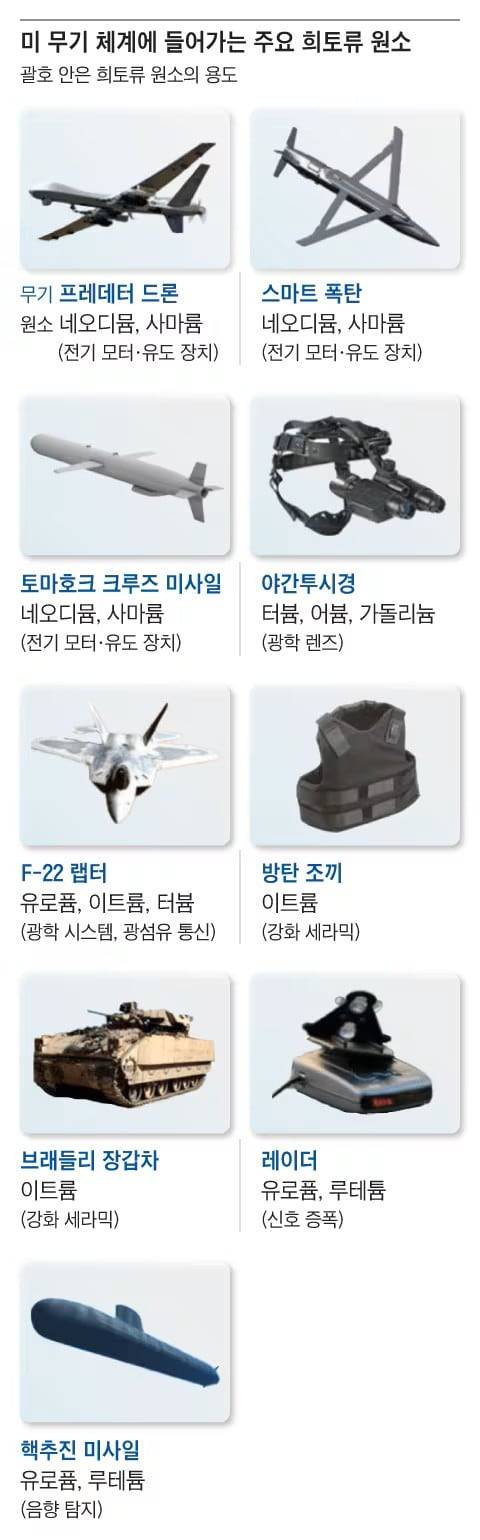 중국의 희토류 위협은 이번이 처음이 아니다. 트럼프의 고율 관세에 맞서, 지난 4월 3일에도 7종의 희토류 원소와 관련 제품에 대한 수출 통제를 했다. 그때도 희토류 자석을 쓰는 미국의 자동차 생산라인과 독일ㆍ오스트리아의 자동차 부품 공장이 멈춰야 했다. 13종의 희토류 금속은 자동차ㆍ풍력 터빈ㆍ전투기ㆍ미사일 등에 들어가는 고성능ㆍ내열(耐熱)ㆍ영구 자석, 배터리, 형광체를 제조하는 데 쓰이는 핵심적인 물질이다.
