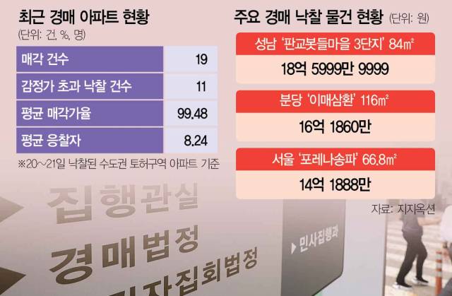 22일 경·공매 데이터업체 지지옥션에 따르면 토지거래허가구역에 지정된 서울 송파구와 서초구, 성남 분당구 등 수도권 아파트 중 20~21일 이틀간 응찰이 완료된 19곳의 평균 매각가율은 99.48%에 달하는 것으로 조사됐다. 감정가보다 높게 팔린 곳은 11곳으로 절반을 넘었다. 평균 응찰자 수는 8.24명을 기록했다. 서울 전역과 경기 12개 지역이 이달 20일부터 토허구역으로 지정된 만큼 경매로 아파트를 낙찰받으면 토허구역 규제에서 제외돼 전세를 끼고 갭 투자가 가능하기 때문으로 풀이된다.