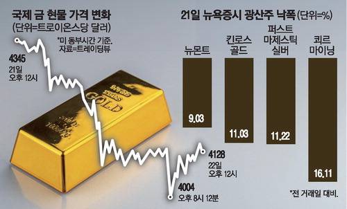 전날까지만 해도 트로이온스당(1트로이온스=약 31.1g) 4400달러 선 돌파를 넘봤던 금값은 21일 한때 4100달러 밑으로 추락했다. 미국 정부의 셧다운 종료 기대감 등으로 달러화 강세가 이어진 것도 금값 하락의 배경이 됐다.