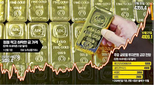 올해 금값은 가파르게 상승했다. 지난 3월 트로이온스당 3000달러를 돌파한 뒤 이달 초 4000달러를 넘어섰고, 불과 두 달 사이 25% 이상 급등했다. 전날에도 현물 기준으로 온스당 4381달러 선까지 오르며 사상 최고치를 경신했다. 올해 들어서만 60% 가까이 상승했다.