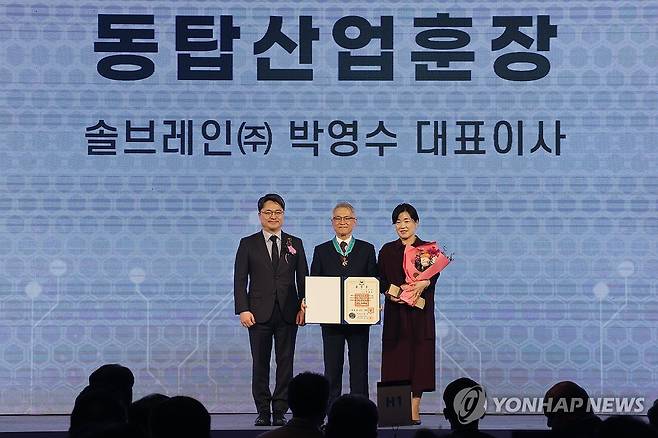 (서울=연합뉴스) 임화영 기자 = 박영수 솔브레인 대표이사가 22일 서울 강남구 그랜드 인터컨티넨탈 서울 파르나스에서 열린 '제18회 반도체의 날 기념식'에서 동탑산업훈장을 수여받은 뒤 기념촬영하고 있다. 왼쪽부터 문신학 산업통상부 제1차관, 박 대표이사, 박 대표이사의 아내. 2025.10.22
