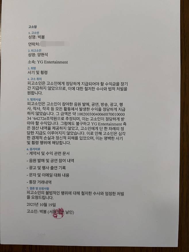 그는 "피고소인은 고소인이 참여한 음원 발매, 공연, 방송, 광고, 행사, 작사, 작곡 등 모든 활동에서 발생한 수익을 정당하게 지급하지 않았다"며 "그 금액은 약 1002003004006007001000034 '64272e조억 원으로 추정되며, 이는 고소인이 정당하게 받아야 할 수익이다. 그럼에도 불구하고 YG엔터테인먼트 측은 정산 내역을 제공하지 않았고, 고소인에게 단 한 차례의 정당한 지급도 이뤄지지 않았다. 이로 인해 고소인은 심각한 경제적 손실과 정신적 피해를 입었으며, 이는 명백한 사기 및 횡령 행위에 해당한다"고 주장했다.