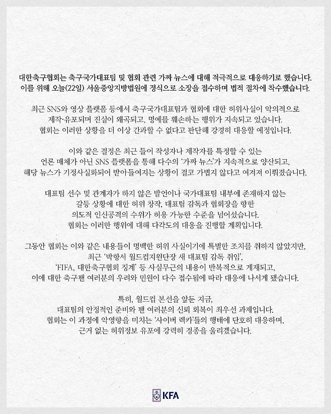 축구협회는 소셜네트워크서비스(SNS), 영상 플랫폼 등에서 축구대표팀과 축구협회 관련 허위사실을 악의적으로 제작, 유포하여 진실을 왜곡하고 명예훼손을 일삼는 활동을 더 이상 간과할 수는 없다는 판단으로 강경하게 대응할 예정이다.