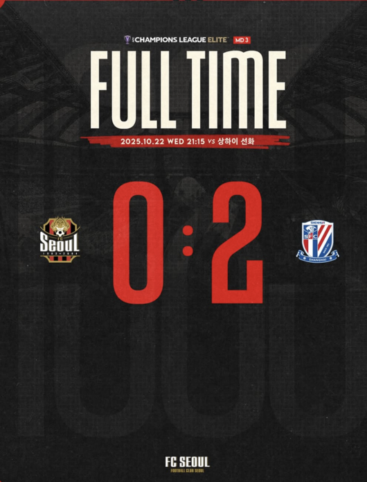 서울은 22일 오후 9시 15분(한국시간) 중국 상하이 스타디움에서 열린 2025~2026 아시아축구연맹(AFC) 챔피언스리그 엘리트 리그(ACL) 페이즈 A조 3차전 원정 경기에서 상하이 선화에 0-2로 패했다.