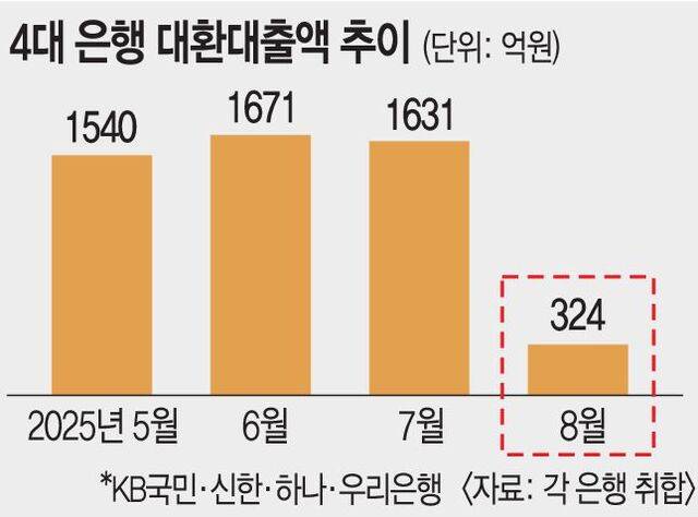 KB국민·신한·하나·우리 4대 은행의 대환대출 실행 규모 추이를 보면 지난 5월 1540억원, 6월 1671억원, 7월 1631억원으로 1600억원 안팎에서 오르내리다 8월에는 전월의 5분의 1 수준인 324억원으로 급감했다. 은행권은 신청 후 실행까지 한 달가량의 시차가 있어 6·27 대책 여파가 8월에 반영된 것으로 본다.