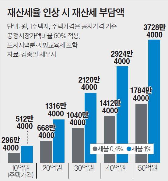 중앙일보가 김종필 세무사와 시뮬레이션한 결과 재산세율을 1%로 올리면 이 아파트의 재산세는 512만4000원으로 연 216만원 증가한다. 20억원 아파트의 경우 연 668만4000원에서 1316만4000원으로 648만원, 50억원 아파트의 경우 1784만4000원에서 3728만4000원으로 1944만원 늘어난다. 다만 세 부담 한도 적용에 따라 실제 부담액은 연간 단위로 점차 증가한다.