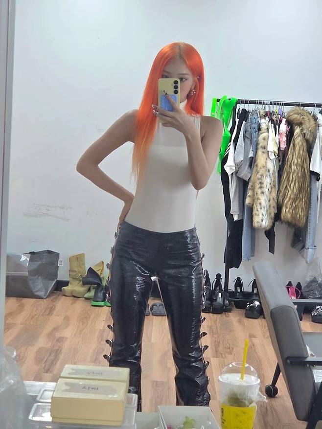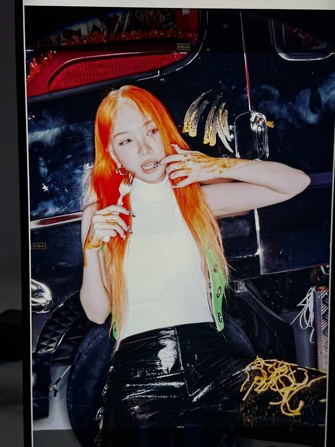 사진 속 그는 선명한 오렌지빛 헤어에 과감한 메이크업을 더해 강렬한 분위기를 연출했다. 흰색 슬리브리스 상의와 블랙 레더 팬츠에 토마토 소스를 묻힌 듯한 독특한 콘셉트로 독보적인 존재감을 드러냈다.