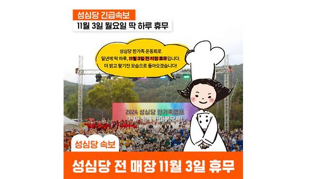 성심당은 홈페이지를 통해 "11월 3일은 전 직원이 한마음으로 모이는 연례행사 '한가족 운동회' 날"이라며 "활기찬 시간을 보내고 더 밝은 에너지로 돌아오겠다"고 공지했습니다.