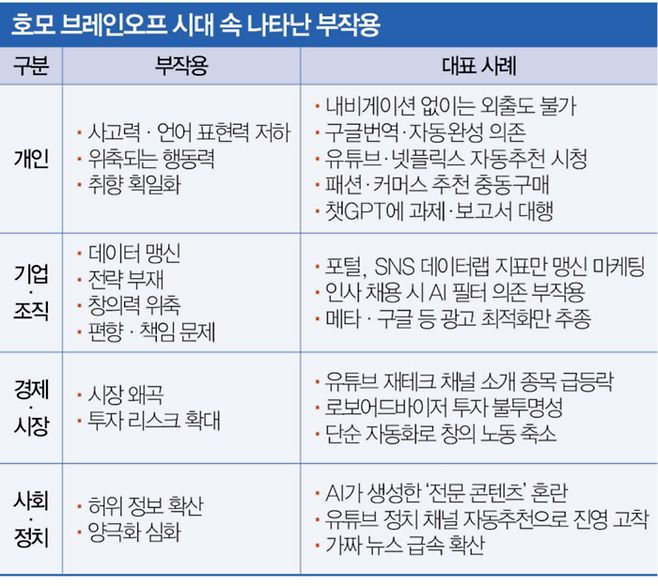 브레인오프 흐름은 한국 사회 특유의 교육·문화와도 맞닿아 있다. 오랜 기간 주입식, 정답 중심 교육을 받아온 세대에게 정답을 빠르게 알려주는 AI는 더없이 유익한 도구다. 해석과 과정보다는 효율과 속도를 중시하는 이런 사회 분위기 속에 생성형 AI 이용 비용까지 저렴해졌다. 사용자가 빠르게 늘면서 ‘나만 쓰지 않으면 도태된다’는 불안감이 브레인오프 현상을 더욱 가속화했다. 이병훈 중앙대 사회학과 교수는 “한국 교육은 성적과 대입에만 몰두하면서 비판적·창의적 사고를 메마르게 했다”며 “AI 교육도 기술 사용법만 강조할 뿐 사회적 위험이나 부정적 파급 효과를 따져 묻는 과정이 부족하다”고 꼬집었다.