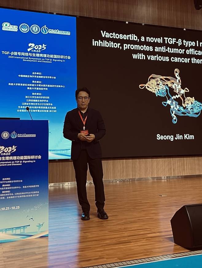 이번 행사에는 TGF-β(형질전환증식인자 베타) 분야의 세계적 석학이기도 한 김성진 대표가 주요 연사로 초청받아 '종양 미세환경을 조절하는 TGF-β 억제제의 임상 개발 현황'이라는 주제로 발표했다.