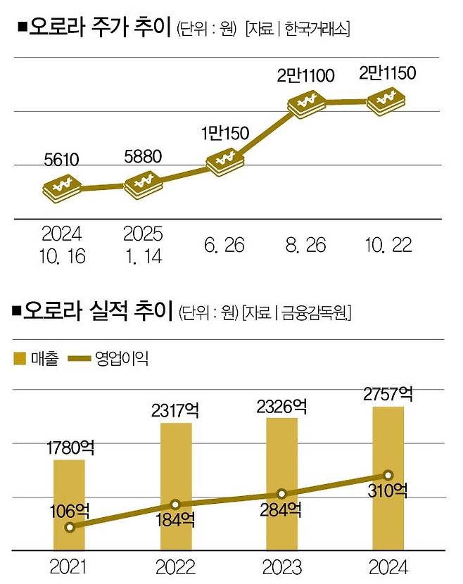 이런 호재에 힘입어 오로라의 주가는 상승 곡선을 그리고 있다. 현재 주가는 2만1150원(10월 22일)으로 1년 전 5610원(10월 16일) 대비 3배가량 상승했다. 실적이 뒷받침된 주가 상승이지만, 단기간 급등했다는 점은 유념할 필요가 있다.