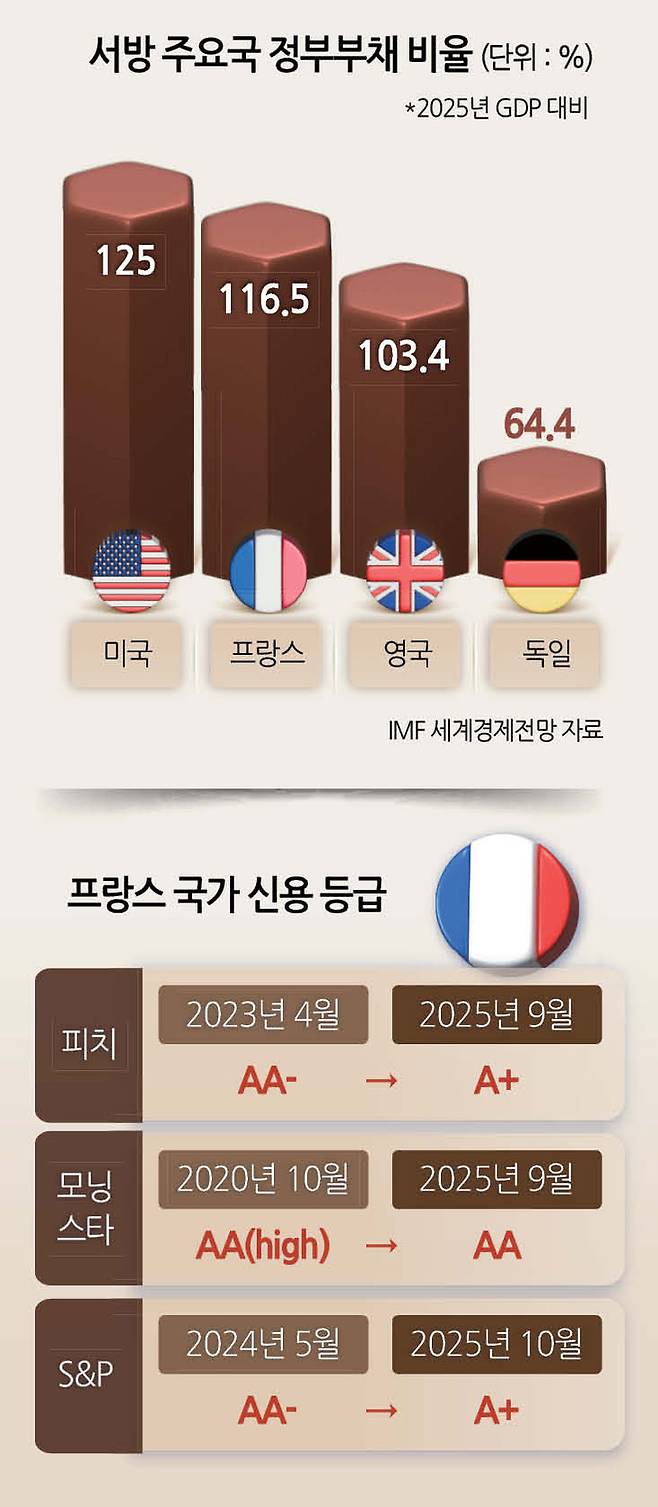 그러나 시장의 의심은 깊어지고 있다. 파이낸셜타임스(FT)에 따르면 최근 프랑스 국채 금리는 로레알·에어버스·악사 등 주요 프랑스 기업의 회사채 금리보다 높은 수준으로 형성됐다. 부채 비율은 그리스(152%)나 이탈리아(138%)보다 낮지만, 국채 금리는 오히려 그리스보다 높다. 이는 투자자들이 프랑스 국채를 그리스보다 더 위험한 자산으로 평가하고 있음을 보여준다.