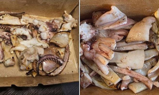 사진 속 철판오징어는 짧게 잘린 다리 여러 조각이 전부였다. 몸통 조각은 찾아보기 힘들었으며 종이 상자 크기 대비 양이 현저히 적었다. A씨는 “먹다 찍은 게 아니다”라며 “불쇼까지 하면서 시선을 사로잡고 (양을) 빼돌렸다”고 주장했다.