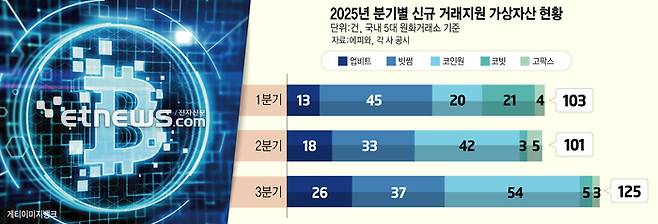 23일 가상자산 평가·분석 플랫폼 에피와에 따르면 올해 3분기 국내 5대 거래소(업비트·빗썸·코인원·코빗·고팍스)의 원화마켓 신규 상장 건수는 총 125건으로 집계됐다. 이는 직전분기(101건)보다 약 28% 이상 늘어난 수준이다.