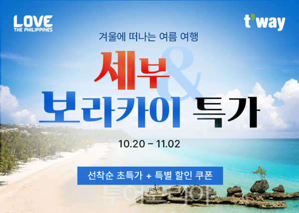 티웨이항공은 필리핀 관광부와 공동으로 필리핀 세부 및 보라카이(칼리보) 노선 프로모션을 오는 11월 2일(일)까지 프로모션을 진행한다. 탑승 기간은 일부 기간을 제외한 내년 1월 20일까지다.
