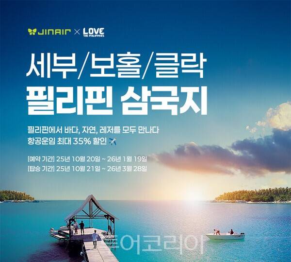 진에어가 필리핀 주요 노선의 항공 운임 할인 프로모션을 내년 1월 19일까지 하고 인천~세부, 보홀, 클락 노선과 부산~세부 등 4개 노선을 최대 35% 할인한다. 할인항공권 탑승 기간은 내년 3월 28일까지다.