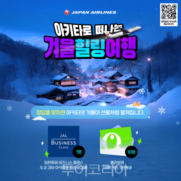 이번 프로모션 기간 동안 일본항공은 전용 프로모션 페이지를 통해 누구나 참여 가능한 아키타현 관련 퀴즈 이벤트를 진행한다. 참가자 중 추첨을 통해 김포 출발 도쿄 경유 아키타행 비즈니스 클래스 왕복 항공권을 비롯해 풍성한 경품을 제공할 예정이다. 이벤트 및 응모 방법은 일본항공 공식 카카오톡 채널에서 확인할 수 있다.
