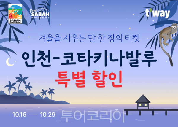 티웨이항공이 말레이시아 사바 관광청과 함께 코타키나발루 여행객을 위한 프로모션을 이달 29일(수)까지 티웨이항공 홈페이지와 모바일 앱(웹)에서 진행한다.