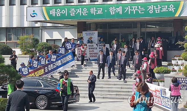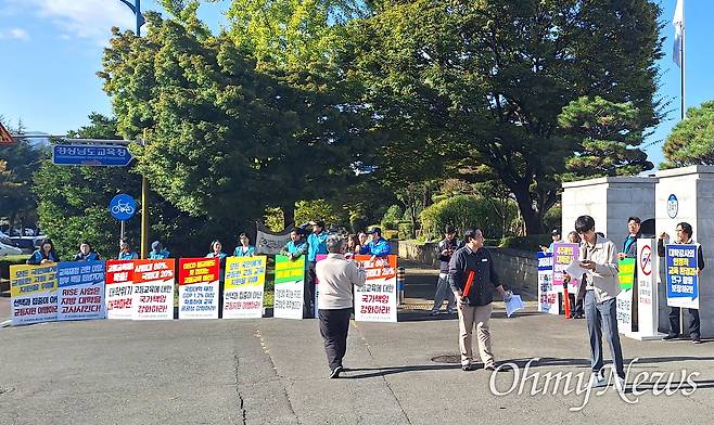 | ▲ 23일 경남도교육청에서 국회 교육위원회의 국정감사가 열린 가운데, 교육 관련 노동단체들이 바깥에서 다양한 활동을 벌였다. |