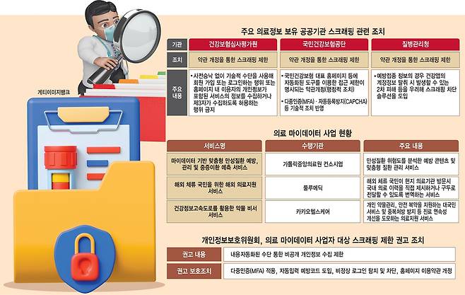 정부가 의료데이터에 대한 스크래핑(일괄 자동수집)에 제동을 걸었다. 무분별한 정보수집과 인증수단 관리 취약성이 꾸준히 제기되면서 이용을 제한한 것이다. 개인이나 기업의 의료 데이터 활용이 확대되는 상황에서 이에 걸맞은 보호조치라는 평가다. 다만 법상으로 스크래핑이 불법이 아닌데다 오랫동안 광범위하게 사용하던 기술인만큼 획일적인 금지보다는 안전성 강화 대책 마련이 우선이라는 주장도 제기된다.