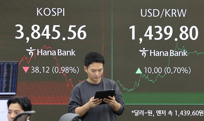 [23일 서울 중구 하나은행 딜링룸 현황판에 코스피 종가와 원/달러 환율이 표시돼있다. 이날 코스피는 38.12포인트(0.98%) 내린 3,845.56, 코스닥 지수는 7.12포인트(0.81%) 내린 872.03로 거래를 마감했다. (사진=연합뉴스)]
