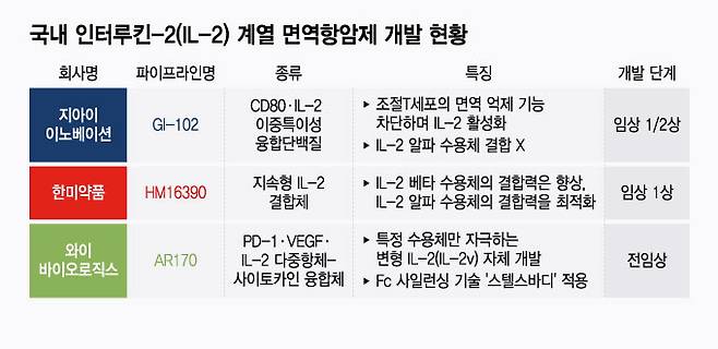 IL-2는 T세포와 자연살해(NK)세포 등 면역세포의 증식과 생존에 관여하는 사이토카인이다. 사실 수년 전까지만 해도 관심도가 낮아진 타깃 중 하나였다. IL-2 제제의 낮은 내약성 때문이다. 이에 글로벌 제약사 등은 IL-2를 활성화시킬 경우 조절T세포의 발현이 갑자기 높아지며 부작용이 발생한다고 보고 조절T세포의 발현을 높이지 않는 약물을 개발하는 데 집중해왔다.